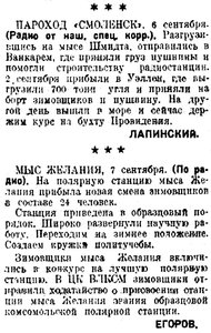 «Красин» достиг острова Врангеля и снял оттуда зимовщиков, бессменно работавших на острове 5 лет. Попутно «Красин» провел в районе о. Врангеля (северо-западнее его) значительную научную работу. Итоги этой работы вместе с материалами, добытыми «Сибиряковым» и «Литке», а также экспедицией «Челюскина» в районах несколько южнее о Врангеля, дадут нам ясное представление о навигационном и ледовом режиме этого труднейшего участка Северного морского пути.