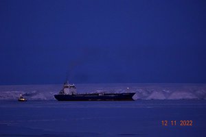 Слиться до южака не успел и проторчал у причала почти две недели. Примёрз и прямо сейчас его уводит "Арктика" на восток.
