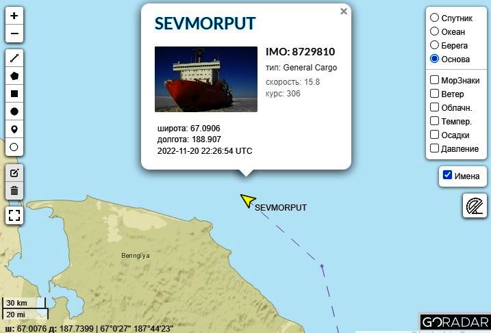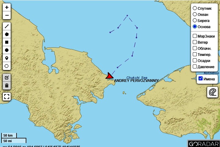 Капасёв пишет:"Андрей Первозванный" едва не протаранил Аляску, откатился вчера к Уэлену, а сейчас находится у Сердце-Камня. Похоже на эволюции "Челюскина"