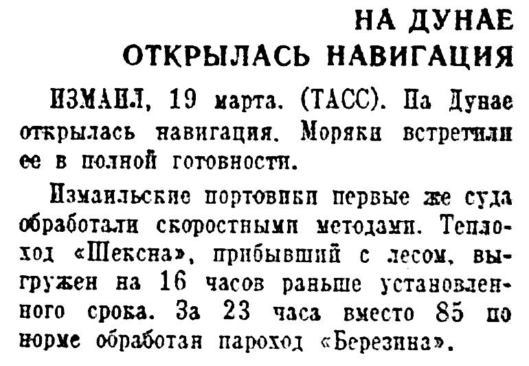 По телеф. от соб. корр.). Навигация на Днепре в разгаре. Речники, используя на редкость высокую ВОДУ стремится досрочно выполнить свои предмайские трудовые обязательства. Ежедневно из Киева, Днепропетровска. Херсона, Запорожья, из портов Десны выходят пассажирские пароходы и буксиры с караванами барж. Точно по графику совершают дальние рейсы буксирные пароходы "Матиас Ракоши», «Академик Карпинский», «Морис Торез» и другие. Их команды взяли на социалистическую сохранность свои суда и буксируемые баржи.