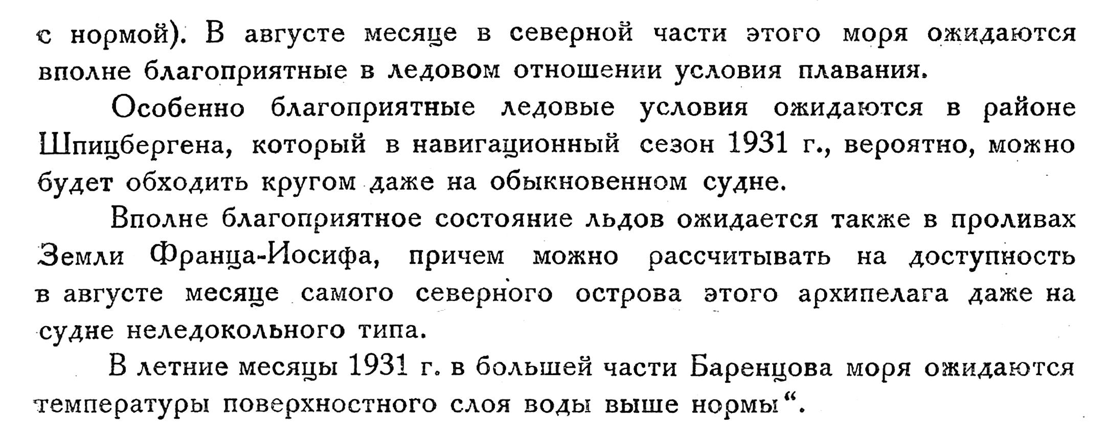 „В Баренцовом море в течение августа и сентября ожидается значительно меньше льдов, чем обычно (1—2 балла). Южные берега Земли Франца-Иосифа будут доступны уже в первой половине июля, западные и северные берега — с первой декады августа. У восточных же берегов архипелага ледовые условия будут менее благоприятными, и доступность этих берегов в навигацию 1931 г. остается под сомнением даже для ледокольных судов.
