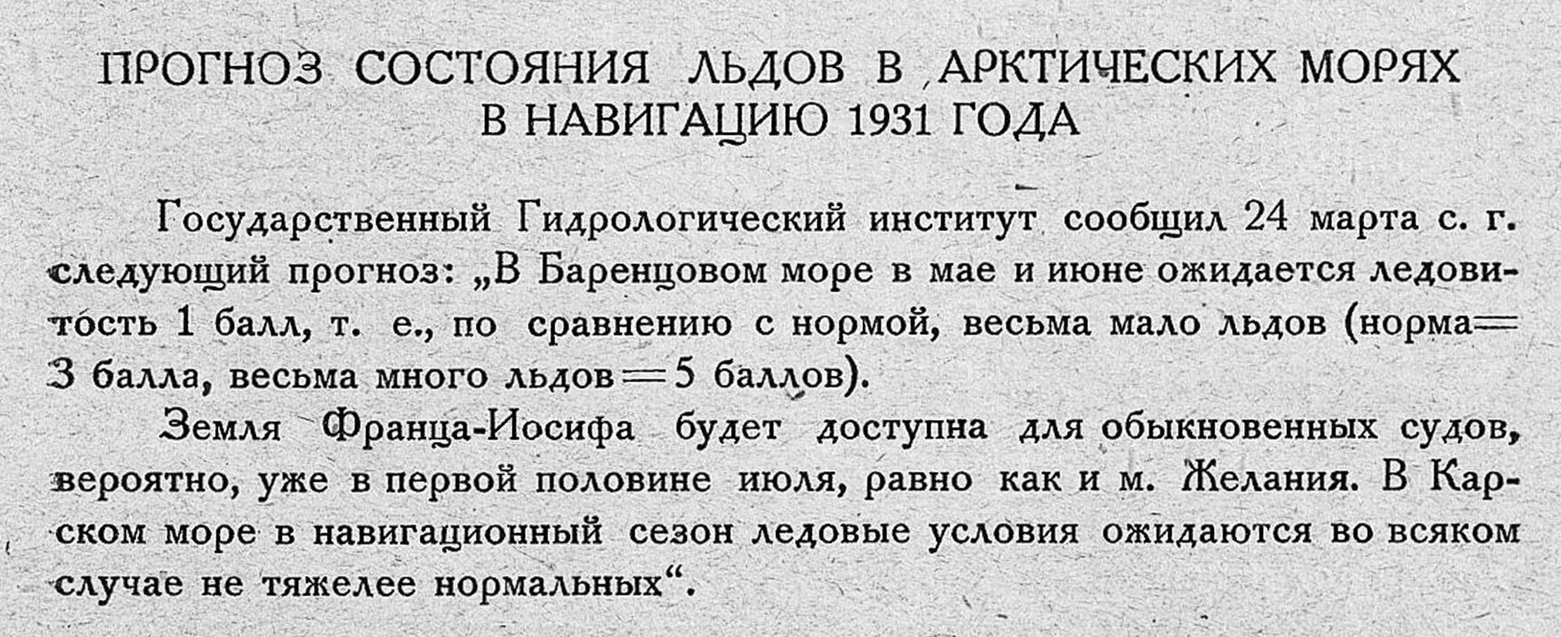 „В Баренцовом море в июле 1931 г. ожидается ледовитость 2 балла (1 балл — очень мало льдов, 5 баллов — очень много льдов, по сравнению с нормой). В августе месяце в северной части этого моря ожидаются вполне благоприятные в ледовом отношении условия плавания.