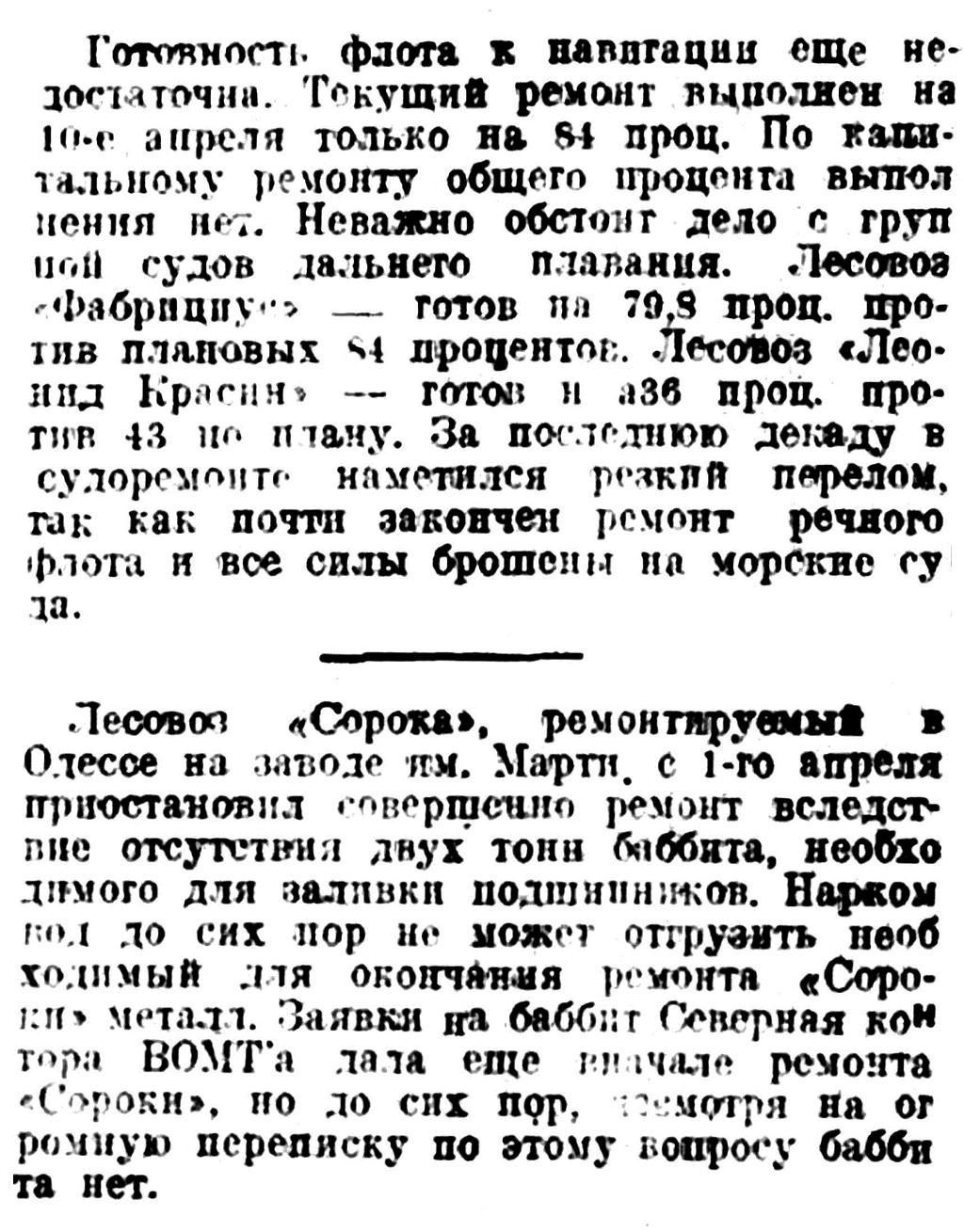 Лесовоз "Сорока", ремонтируемый в Одессе на заводе им. Марти, с 1-го апреля приостановил совершенно ремонт вследствие отсутствия двух тони баббита, необходимого для заливки подшипников. Наркомвод до сих пор не может отгрузить необходимый для окончания ремонта "Сороки" металл. Заявки на баббит Северная контора ВОМТ’а дала еще вначале ремонта "Сороки", но до сих пор, не смотря на огромную переписку по этому вопросу баббита нет.