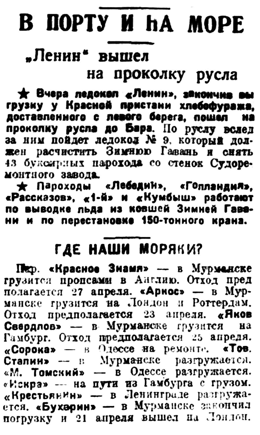 ♦ Вчера ледокол "Ленин", закончил выгрузку у Красной пристани хлебофуража, доставленного с левого берега, пошел на проколку русла до бара. По руслу вслед за ним пойдет ледокол № 9. который должен расчистить Зимнюю Гавань и снять 43 буксирных парохода со стенок Судоремонтного завода.