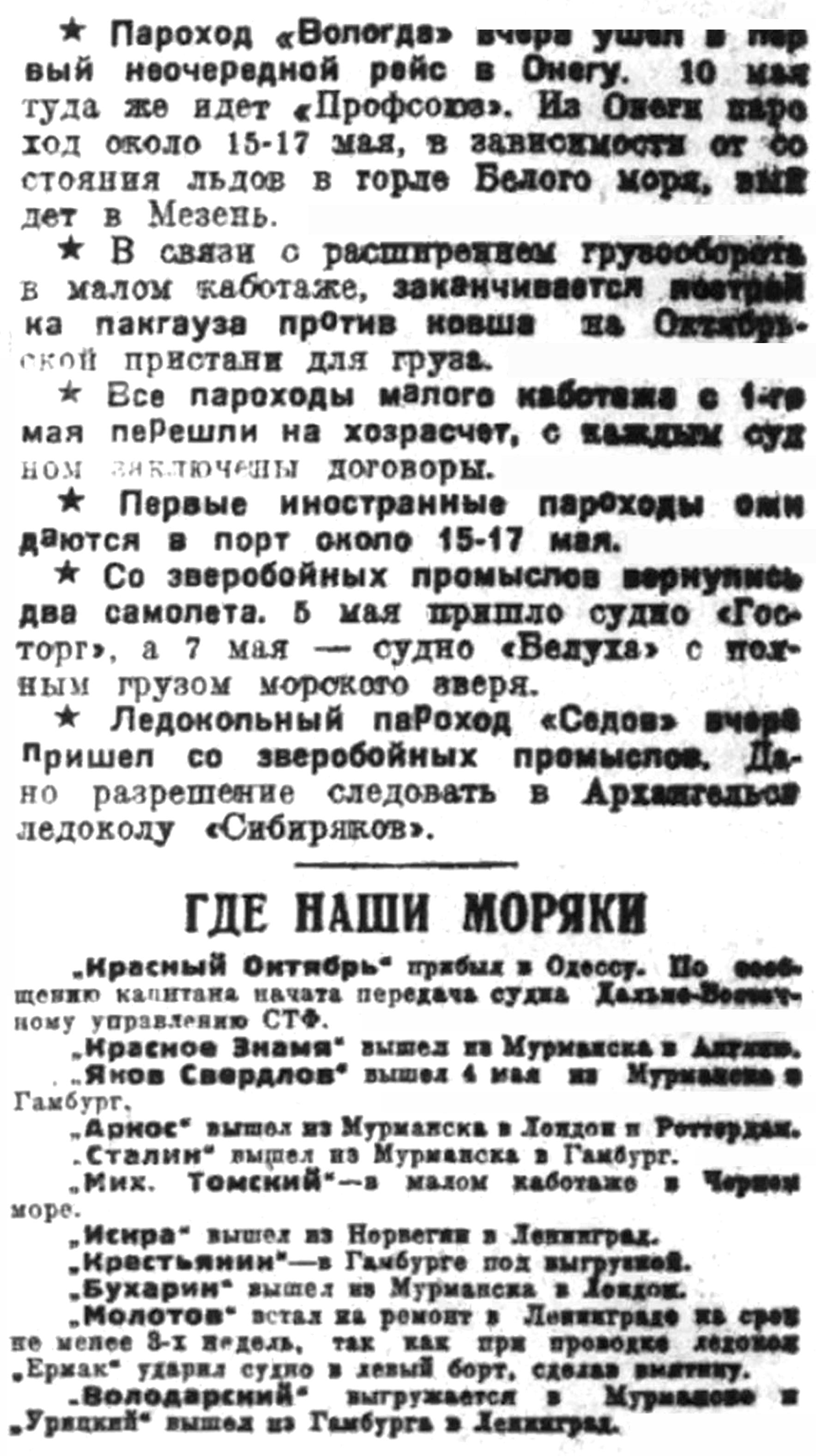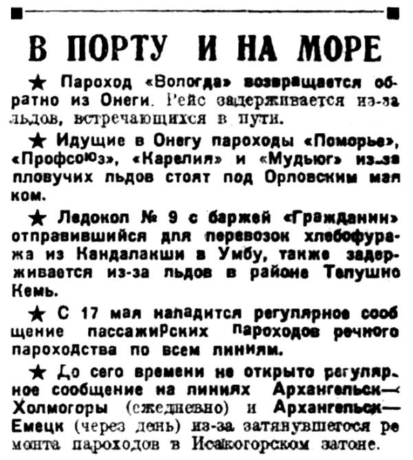 ★ Пароход "Вологда" вчера ушел в первый неочередной рейс в Онегу. 10 мая туда же идет "Профсоюз". Из Онеги пароход около 15-17 мая, в зависимости от состояния льдов в горле Белого моря, выйдет в Мезень.