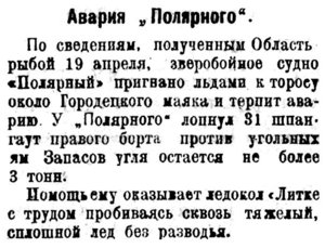 По сведениям, полученным Областьрыбой 19 апреля, зверобойное судно «Полярный» пригнано льдами к торосу около Городецкого маяка и терпит аварию. У "Полярного" лопнул 31 шпангоут правого борта против угольных ям. Запасов угля остается не более 3 тонн.