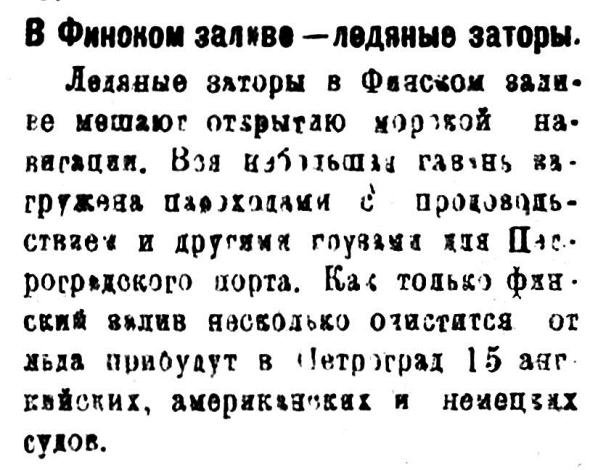 Ледяные заторы в Финском заливе мешают открытию морской навигации. Вся небольшая гавань загружена пароходами с продовольствием и другими грузами для Петроградского порта. Как только финский залив несколько очистится от льда прибудут в Петроград 15 английских, американских и немецких судов.