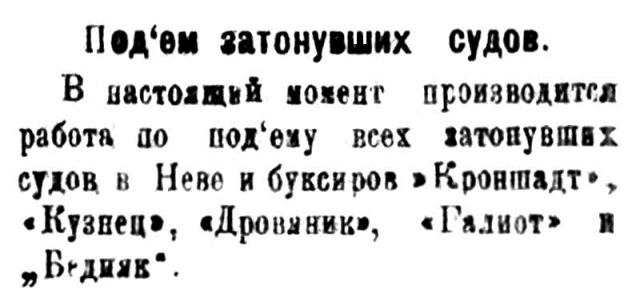 В настоящий момент производятся работа по подъему всех затонувших судов в Неве и буксиров "Кронштадт", "Кузнец", "Дровяник", "Галиот" и "Бедняк".