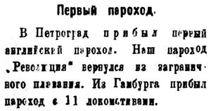 В Петроград прибыл первый английский пароход. Наш пароход "Революция" вернулся из заграничного плавания. Из Гамбурга прибыл пароход с 11 локомотивами.