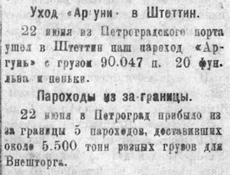 22 июня из Петроградского порта ушел в Штеттин наш пароход «Аргунь» с грузом 90.047 п. 20 фун. льна и пеньки.