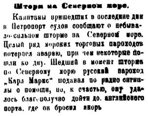 Капитаны пришедших в последние дни в Петропорт судов сообщают о небывало сильном шторме на Северном море. Целый ряд морских торговых пароходов потерпел аварию, при чем некоторые пошли ко дну. Шедший в момент шторма по Северному морю русский пароход "Карл Маркс" подавал по радио сигналы о помощи, но, к счастью, ему удалось благополучно дойти до английского порта, где он бросил якорь.