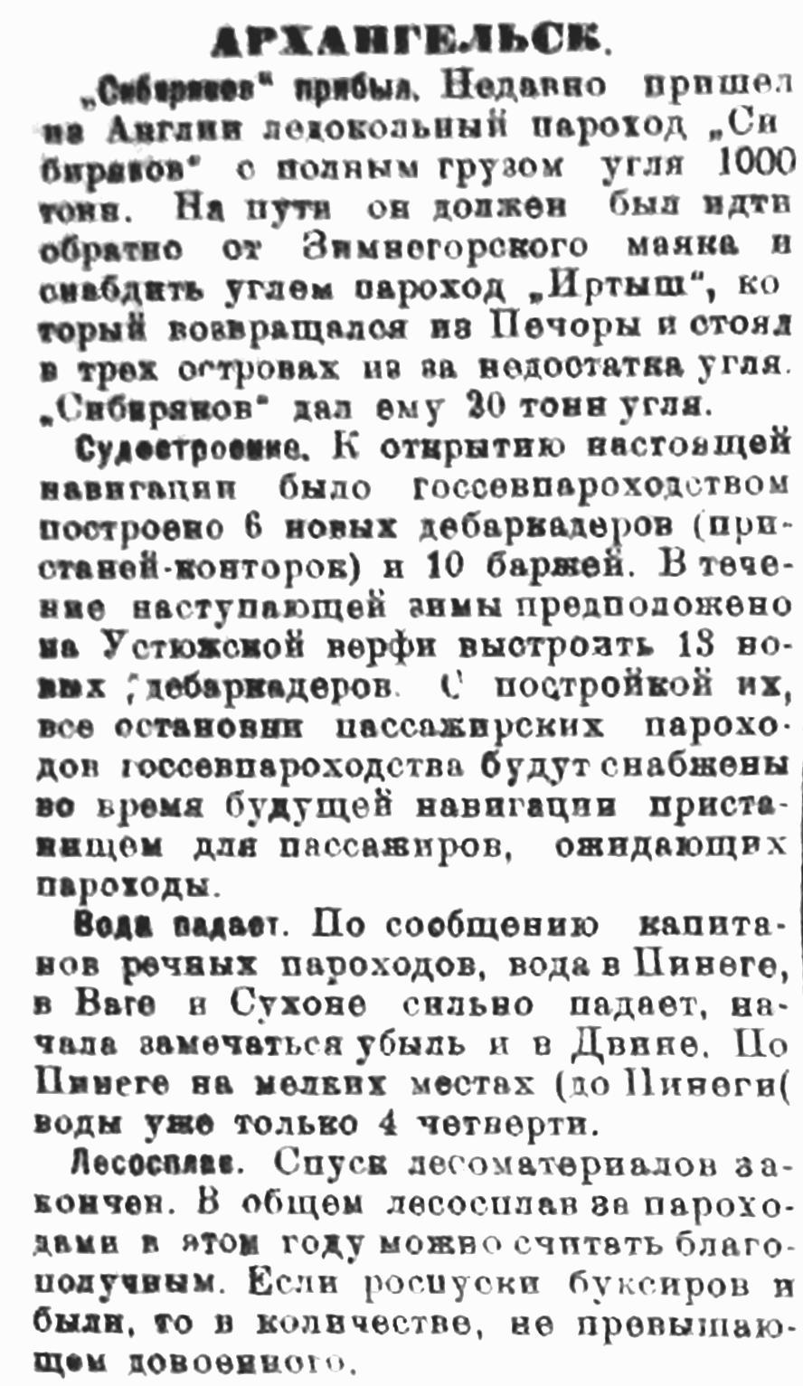 "Сибиряков" прибыл. Недавно пришел из Англии ледокольный пароход "Сибиряков" с полным грузом угля 1000 тонн. На пути он должен был идти обратно от Зимнегорского маяка и снабдить углем пароход "Иртыш", который возвращался из Печоры и стоял в трех островах из-за недостатка угля "Сибиряков" дал ему 20 тонн угля.
