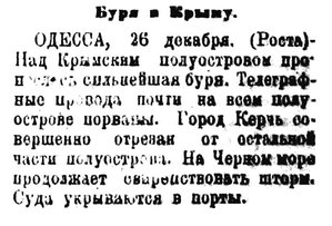 ОДЕССА, 26 декабря. (Роста). Над Крымским полуостровом пронеслась сильнейшая бура. Телеграфные провода почти на всем полуострове порваны. Город Керчь совершенно отрезан от остальной части полуострова. На Черном море продолжает свирепствовать шторм. Суда укрываются в порты.