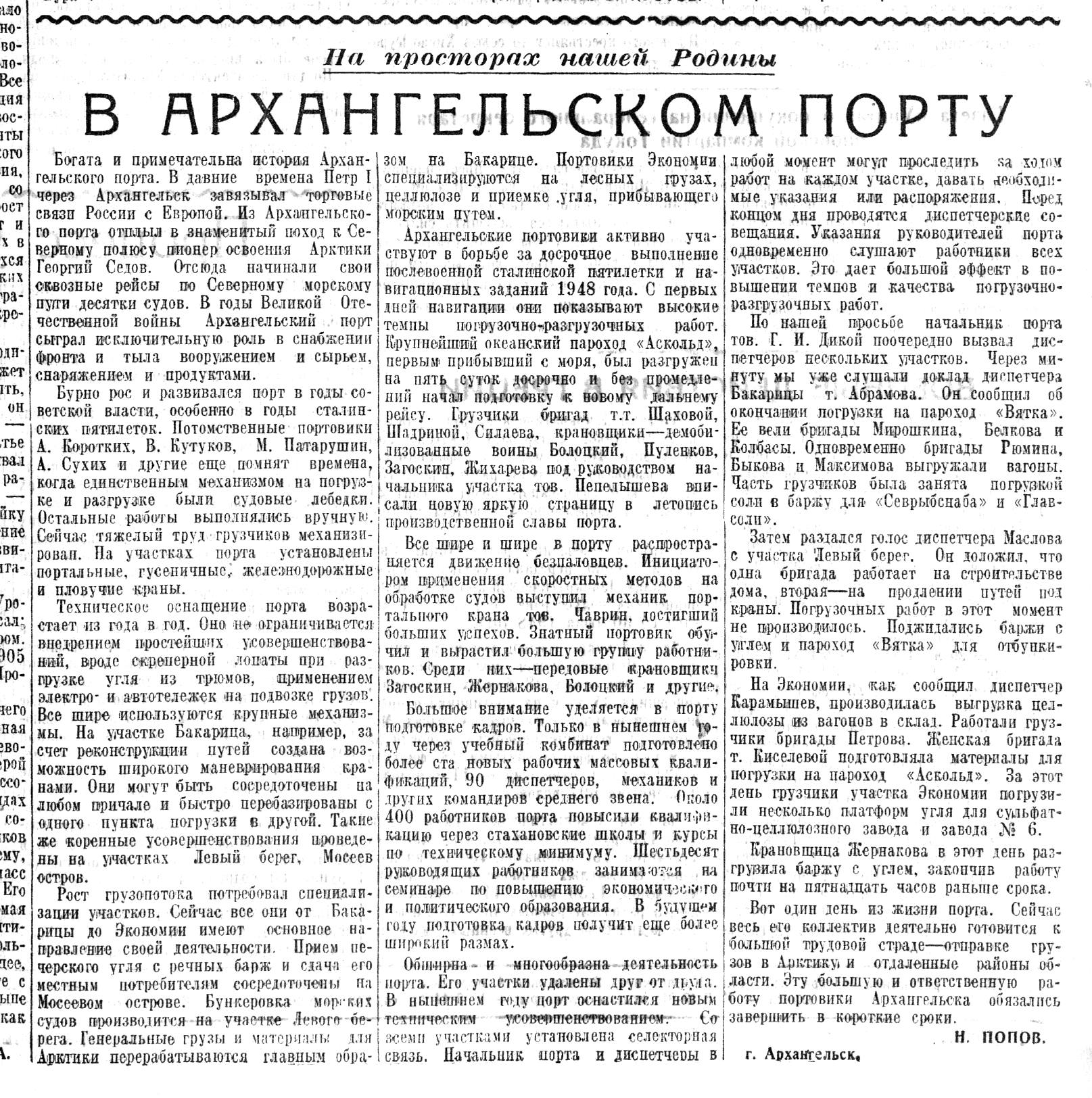 Попов Н.В архангельском порту//Красный воин,1948 г,№ 171(7487), 21 июля