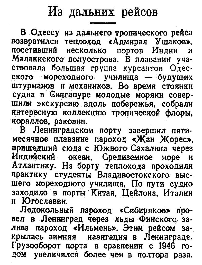 В Одессу из дальнего тропического рейса возвратился теплоход «Адмирал Ушаков», посетивший несколько портов Индии и Малаккского полуострова. В плавании участвовала большая группа курсантов Одесского мореходного, училища — будущих штурманов и механиков. Во время стоянки судна в Сингапуре молодые моряки совершили экскурсию вдоль побережья, собрали интересную коллекцию тропической флоры, кораллов, раковин.