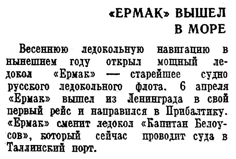 Весеннюю ледокольную навигацию в нынешнем году открыл мощный ледокол «Ермак» — старейшее судно русского ледокольного флота. 6 апреля «Ермак» вышел из Ленинграда в свой первый рейс и направился в Прибалтику. «Ермак» сменит ледокол «Капитан Белоусов», который сейчас проводит суда в Таллинский порт.