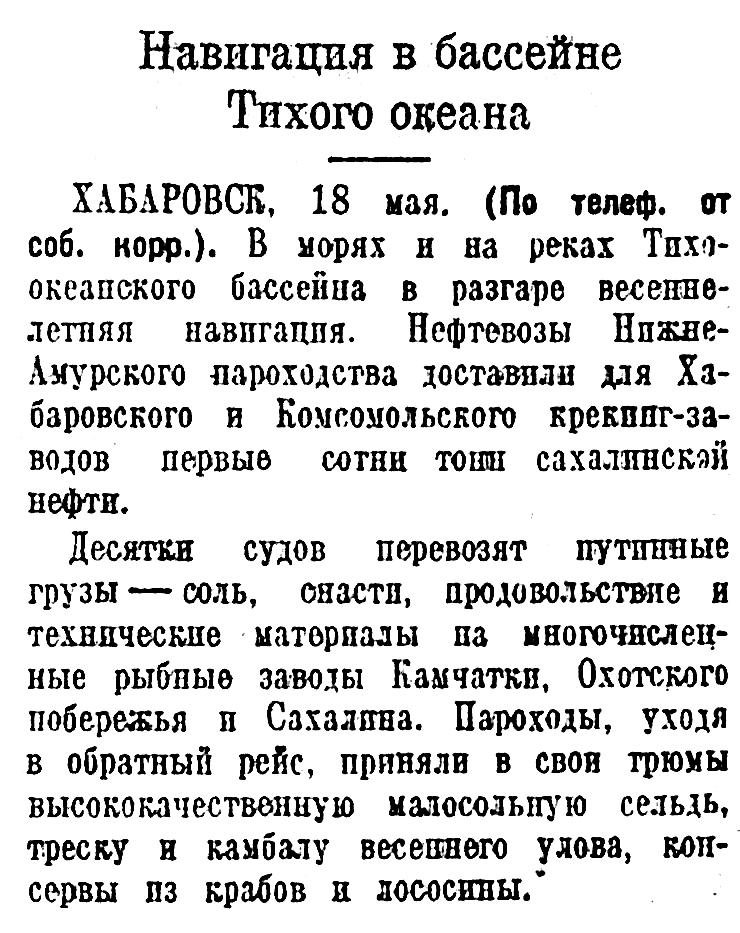 Десятки судов перевозят путинные грузы — соль, снасти, продовольствие и технические материалы на многочисленные рыбные заводы Камчатки, Охотского побережья и Сахалина. Пароходы, уходя в обратный рейс, приняли в свои трюмы высококачественную малосольную сельдь, треску и камбалу весеннего улова, консервы пз крабов и лососины.