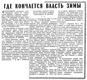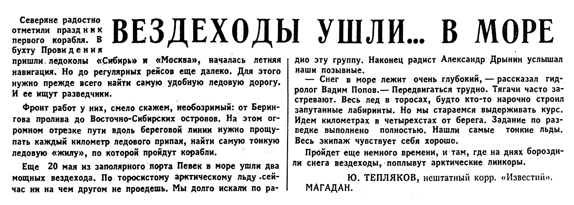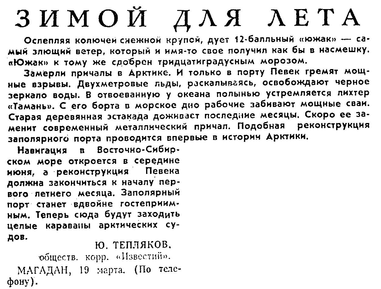 На четверо суток раньше прошлогоднего срока горняки Билибинских приисков Колымского края, строители радостно встретили первые суда: «Иман», «Башкирнефть», «Кировсклес» и другие. Население Колымы получило разнообразные продукты питания, строители — массу необходимых материалов и оборудования.