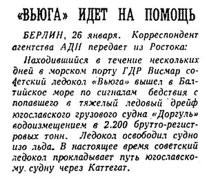 БЕРЛИН, 26 января. Корреспондент агентства АДН передает из Ростока: Находившийся в течение нескольких дней в морском порту ГДР Висмар советский ледокол «Вьюга» вышел в Балтийское море по сигналам бедствия с попавшего в тяжелый ледовый дрейф югославского грузового судна «Доргуль» водоизмещением в 2.200 брутто-регистровых тонн. Ледокол освободил судно изо льда. В настоящее время советский ледокол прокладывает путь югославскому. судну через Каттегат.