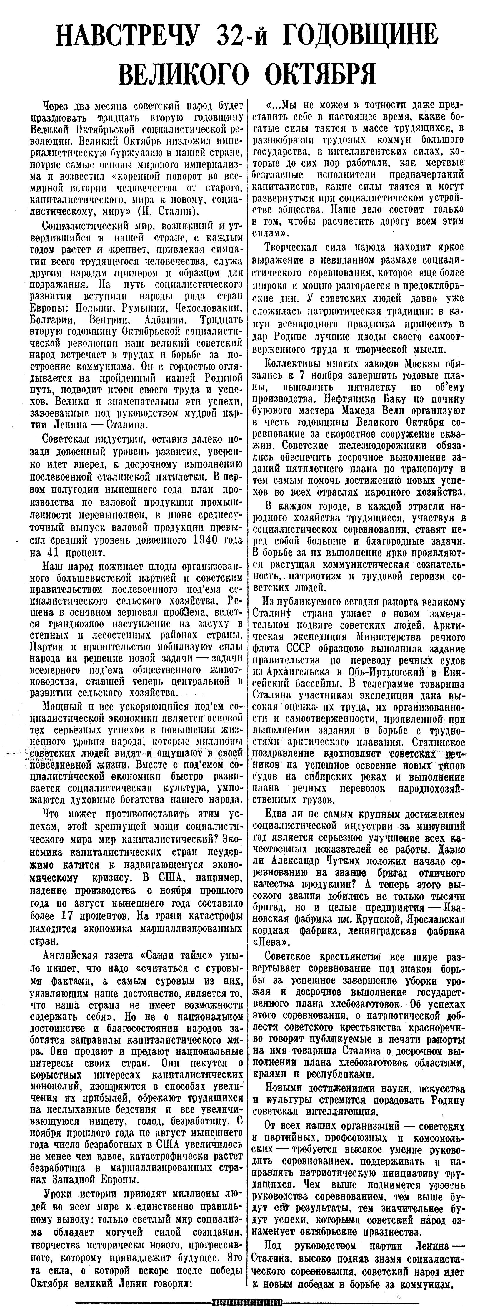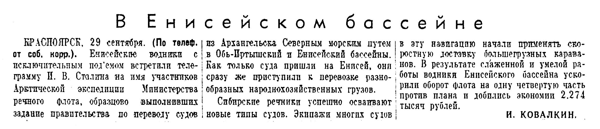 Из публикуемого сегодня рапорта великому Сталину страна узнает о новом замечательном подвиге советских людей. Арктическая экспедиция Министерства речного флота СССР образцово выполнила задание правительства по переводу речных судов из Архангельска в Обь-Иртышский и Енисейский бассейны. В телеграмме товарища Сталина участникам экспедиции дана высокая оценка их труда, их организованности и самоотверженности, проявленной при выполнении задания в борьбе с трудностями арктического плавания. Сталинское поздравление вдохновляет советских речников на успешное освоение новых типов судов на сибирских реках и выполнение плана речных перевозок народнохозяйственных грузов.