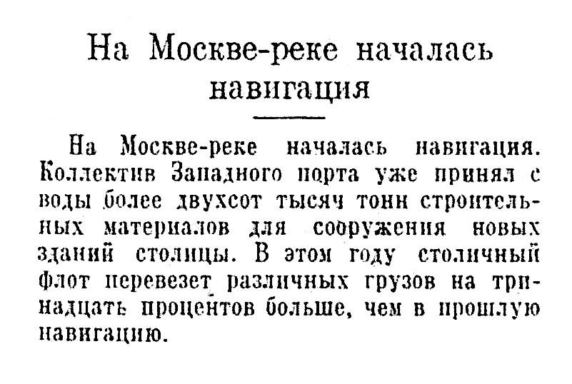 На Москве-реке началась навигация. Коллектив Западного порта уже принял с воды более двухсот тысяч тонн строительных материалов для сооружения новых зданий столицы. В этом году столичный флот перевезет различных грузов на тринадцать процентов больше, чем в прошлую навигацию.