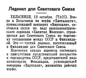 ХЕЛЬСИНКИ, 19 октября. (ТАСС). Вчера в Хельсинки на верфи «Хиеталахти», принадлежащей концерну «Вяртсиля», состоялся спуск на воду дизельэлектрического ледокола «Капитан Мелехов», строящегося для Советского Союза по торговому соглашению между СССР и Финляндией. Это — третий ледокол, изготовляемый в Финляндии для Советского Союза.