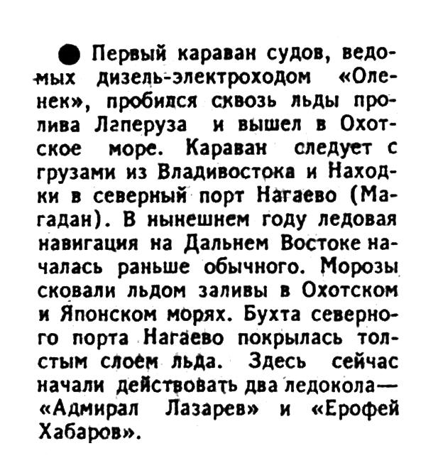 Ныне первые караваны судов отправятся из западных портов страны в Игарку 23—25 июня, а из восточных портов к Певеку — 12 июня. Вот как раздвинула дружина ледоколов короткое северное судоходное лето.