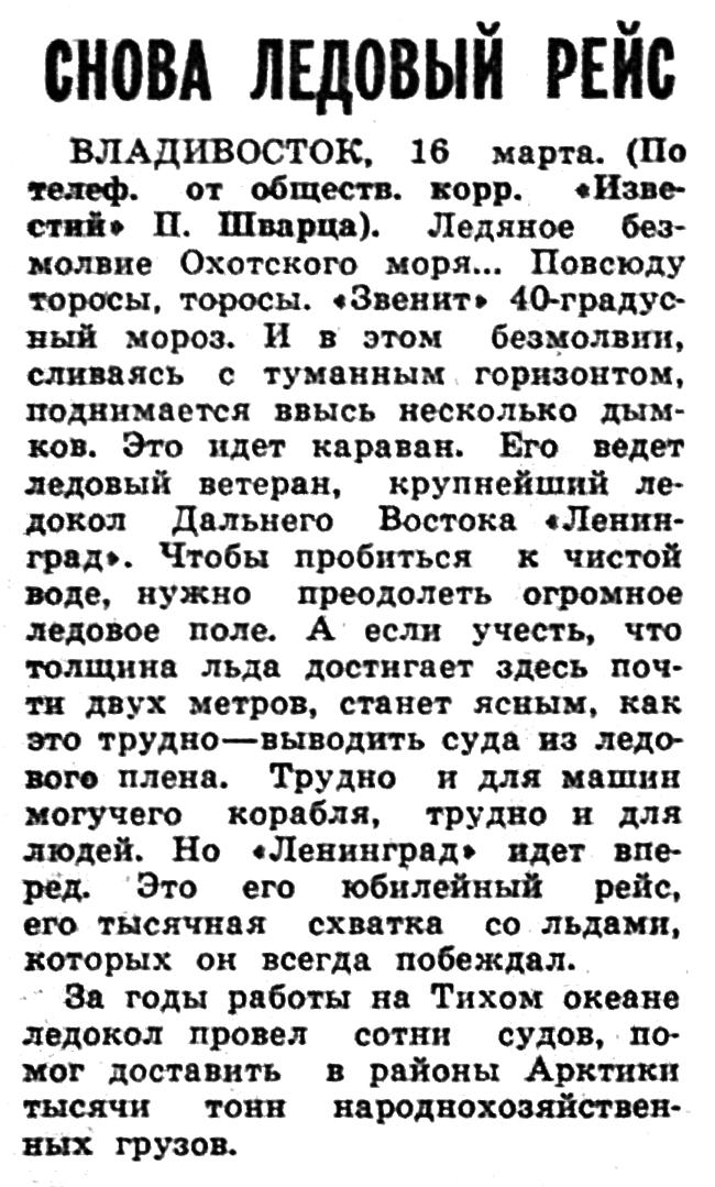 Известия, 1967, № 127 (15521), 31 мая.ЛЕДОКОЛЫ РАЗДВИГАЮТ ЛЕТООт середины июля до середины октября — таковы были короткие сроки навигации на Великом Северном морском пути. Несколько лет назад они ощутимо раздвинулись. В 1966 году первый караван отправился в путь 27 июня, а покинул высокие широты 1 ноября. Нет, не слабее стали льды: крепче стала сталь судов. Арктика испытала на себе силу атомного исполина «Ленин», а затем — мощных дизель-электрических ледоколов «Москва», «Ленинград», «Киев». Сейчас в Финляндии сооружается четвертый корабль из этой серии. Ему присвоено имя Мурманска. Сегодня конструкторы думают над тем, чтобы ледоколы прибавили в силе, но остались такими же маневренными. И творцы судов уже знают, как вписать в те же габариты, какие имеет «Москва», десять тысяч лошадиных сил дополнительно к существующим 26 тысячам.