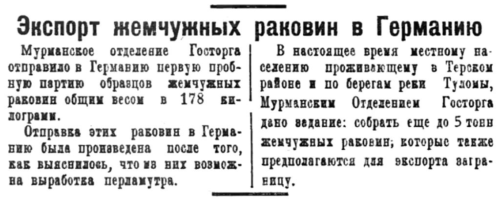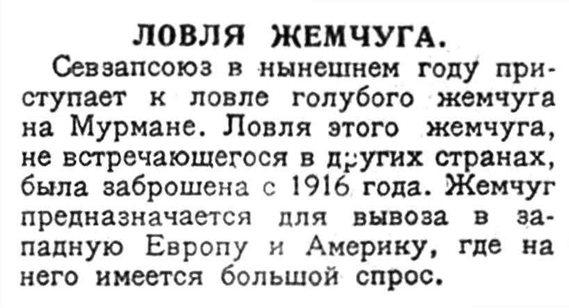 Севзапсоюз в нынешнем году приступает к ловле голубого жемчуга на Мурмане. Ловля этого жемчуга, не встречающегося в других странах, была заброшена с 1916 года. Жемчуг предназначается для вывоза в западную Европу и Америку, где на него имеется большой спрос.