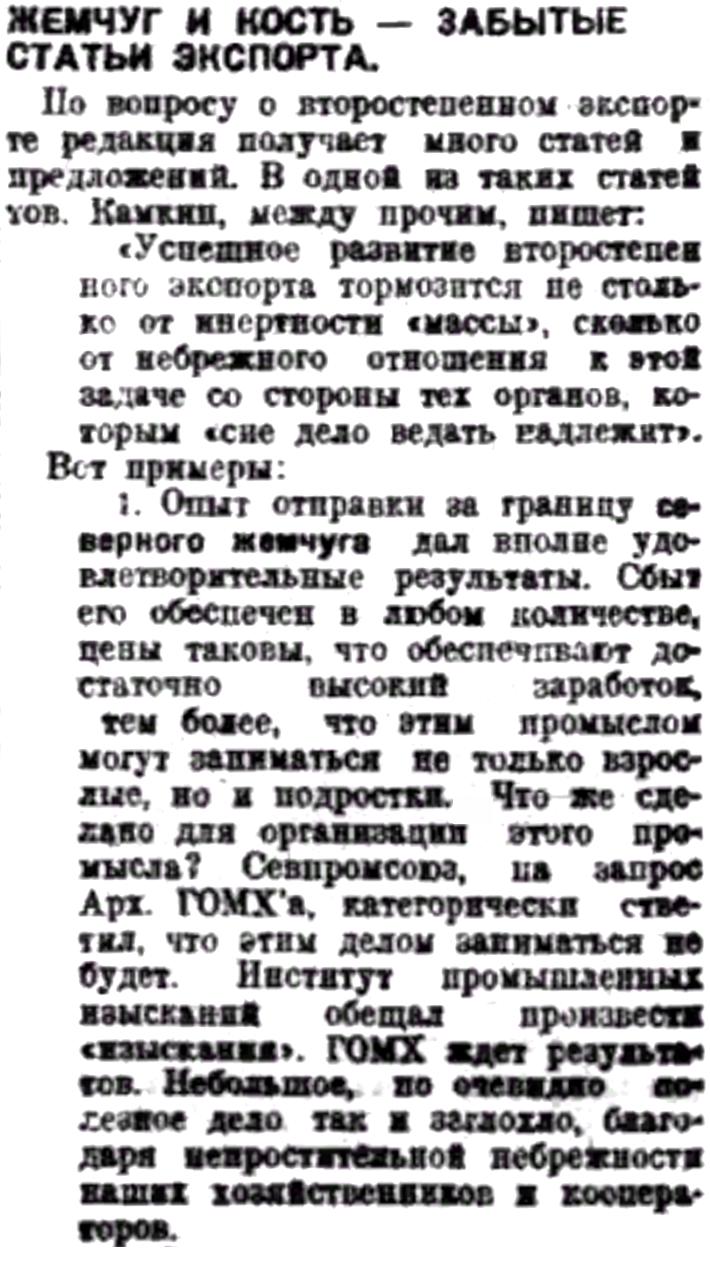 1. Опыт отправки за границу северного жемчуга дал вполне удовлетворительные результаты. Сбыт его обеспечен в любом количестве, цены таковы, что обеспечивают достаточно высокий заработок, тем более, что этим промыслом могут заниматься не только взрослые, но и подростки. Что же сделано для организации этого промысла? Севпромсоюз, на запрос Арх. ГОМХ'а, категорически ответил, что этим делом заниматься не будет. Институт промышленных изысканий обещал произвести "изыскания". ГОМХ ждет результатов. Небольшое, но очевидно полезное дело так и заглохло, благодаря непростительной небрежности наших хозяйственников и кооператоров.