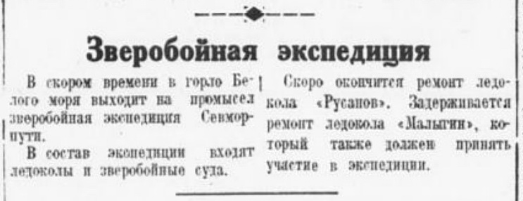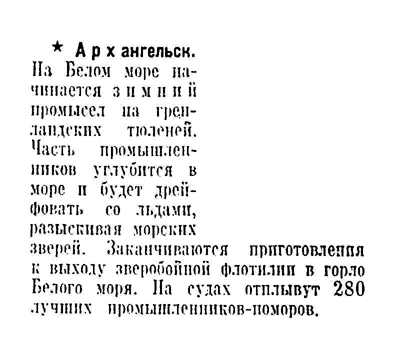 Часть промышленников углубится в море и будет дрейфовать со льдами, разыскивая морских зверей. Заканчиваются приготовления к выходу зверобойной флотилии в горло Белого моря. На судах отплывут 280 лучших промышленников-поморов.