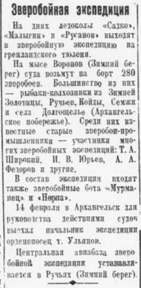 14 февраля в Архангельск для руководства действиями судов выехал начальник экспедиции орденоносец т. Ульянов.