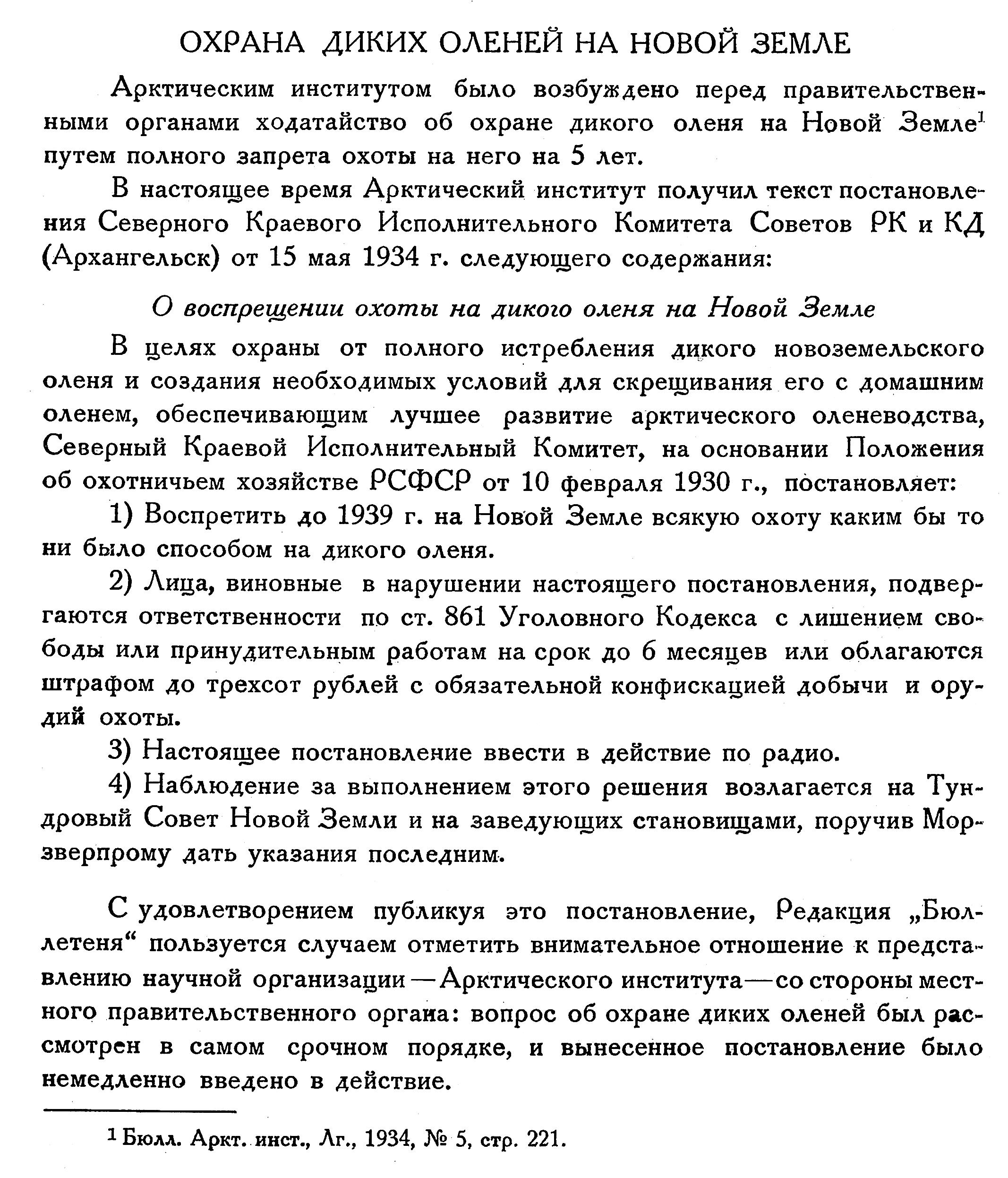 С удовлетворением публикуя это постановление, Редакция „Бюллетеня" пользуется случаем отметить внимательное отношение к представлению научной организации — Арктического института — со стороны местного правительственного органа: вопрос об охране диких оленей был рассмотрен в самом срочном порядке, и вынесенное постановление было немедленно введено в действие.