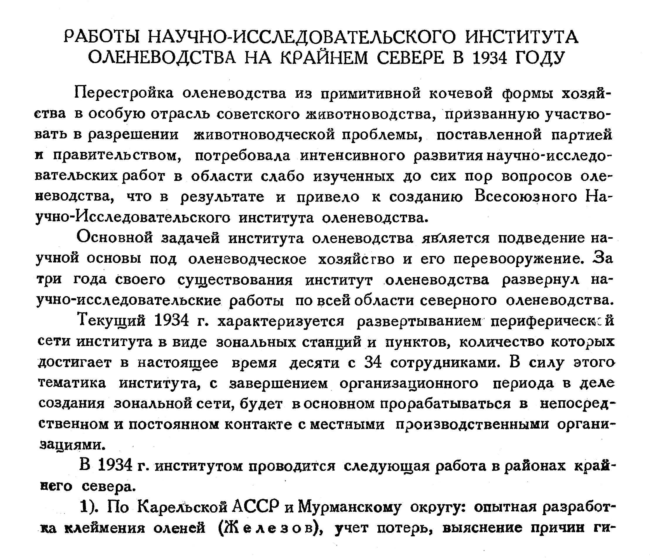 РАБОТЫ НАУЧНО-ИССЛЕДОВАТЕЛЬСКОГО ИНСТИТУТА ОЛЕНЕВОДСТВА НА КРАЙНЕМ СЕВЕРЕ В 1934 ГОДУ