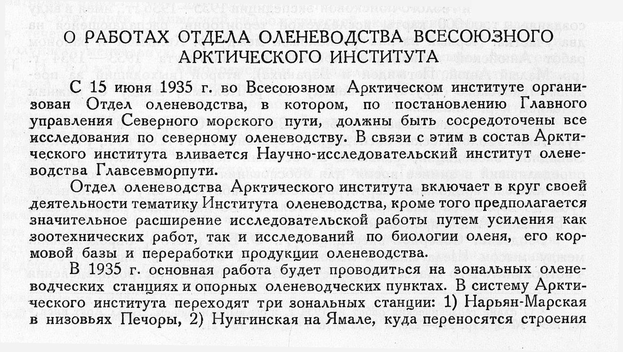 С 15 июня 1935 г. во Всесоюзном Арктическом институте организован Отдел оленеводства, в котором, по постановлению Главного управления Северного морского пути, должны быть сосредоточены все исследования по северному оленеводству. В связи с этим в состав Арктического института вливается Научно-исследовательский институт оленеводства Главсевморпути.