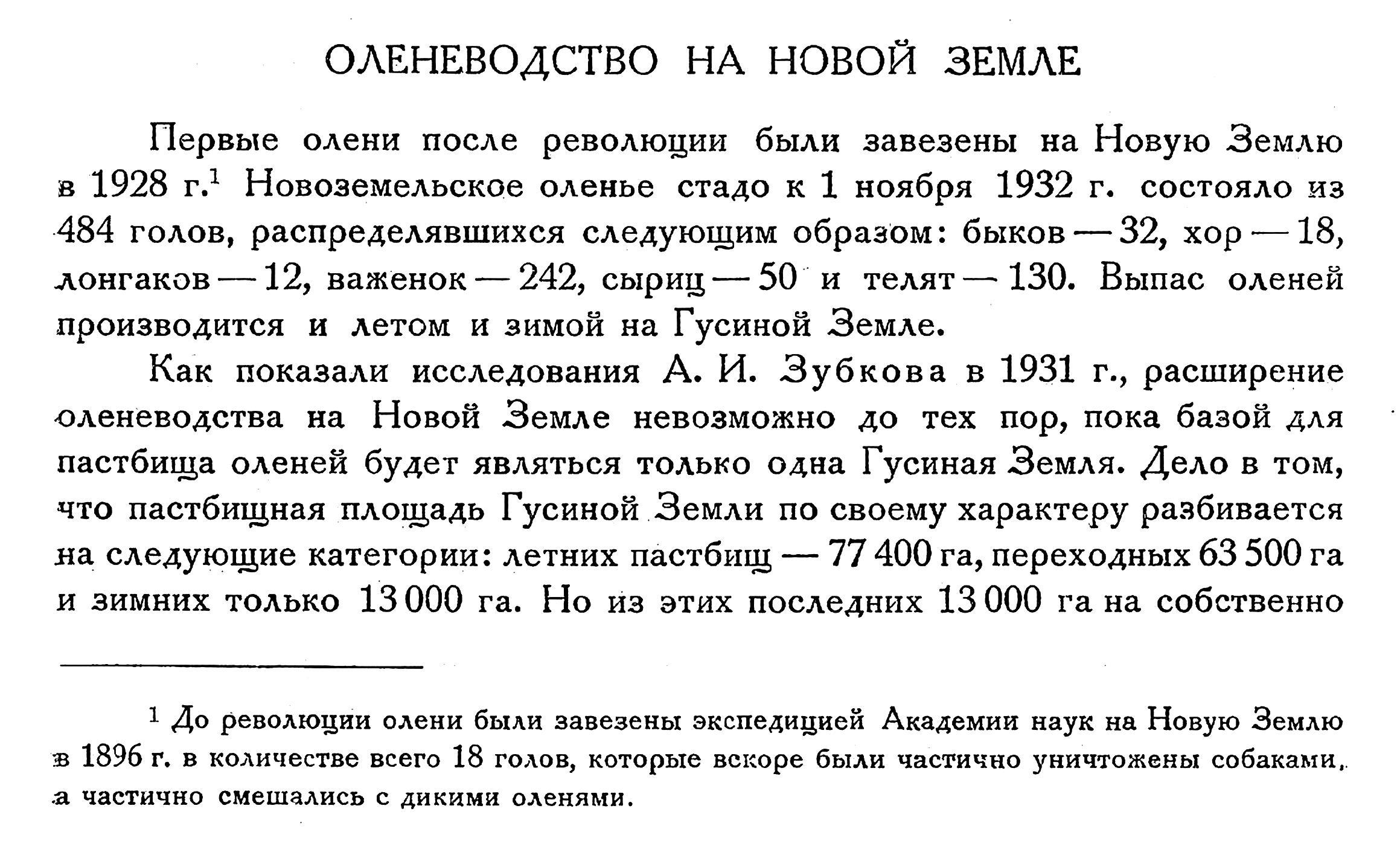 1) До революции олени были завезены экспедицией Академии наук на Новую Землю зз 1896 г. в количестве всего 18 голов, которые вскоре были частично уничтожены собаками,, а частично смешались с дикими оленями.