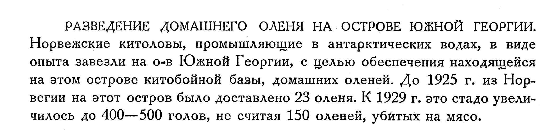 РАЗВЕДЕНИЕ ДОМАШНЕГО ОЛЕНЯ НА ОСТРОВЕ ЮЖНОЙ ГЕОРГИИ. Норвежские китоловы, промышляющие в антарктических водах, в виде опыта завезли на о-в Южной Георгии, с целью обеспечения находящейся на этом острове китобойной базы, домашних оленей. До 1925 г. из Норвегии на этот остров было доставлено 23 оленя. К 1929 г. это стадо увеличилось до 400—500 голов, не считая 150 оленей, убитых на мясо.