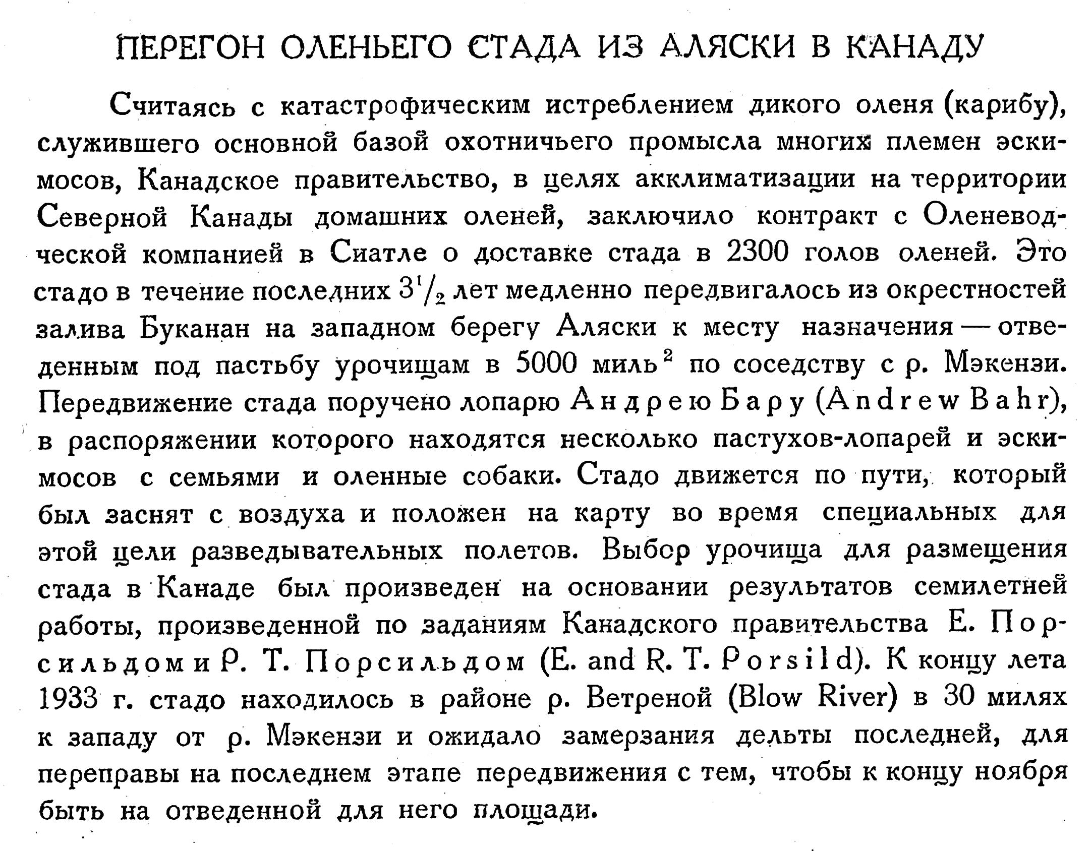 Считаясь с катастрофическим истреблением дикого оленя (карибу), служившего основной базой охотничьего промысла многих племен эскимосов, Канадское правительство, в целях акклиматизации на территории Северной Канады домашних оленей, заключило контракт с Оленеводческой компанией в Сиатле о доставке стада в 2300 голов оленей. Это стадо в течение последних 3 1/2 лет медленно передвигалось из окрестностей залива Буканан на западном берегу Аляски к месту назначения — отведенным под пастьбу урочищам в 5000 миль 2) по соседству с р. Мэкензи. Передвижение стада поручено лопарю Андрею Бару (Andrеw Вahг), в распоряжении которого находятся несколько пастухов-лопарей и эскимосов с семьями и оленные собаки. Стадо движется по пути, который был заснят с воздуха и положен на карту во время специальных для этой цели разведывательных полетов. Выбор урочища для размещения стада в Канаде был произведен на основании результатов семилетней работы, произведенной по заданиям Канадского правительства Е. Порсильдом и Р. Т. Порсильдом (Е. and R. Т. Роrsild). К концу лета 1933 г. стадо находилось в районе р. Ветреной (Blow River) в 30 милях к западу от р. Мэкензи и ожидало замерзания дельты последней, для переправы на последнем этапе передвижения с тем, чтобы к концу ноября быть на отведенной для него площади.