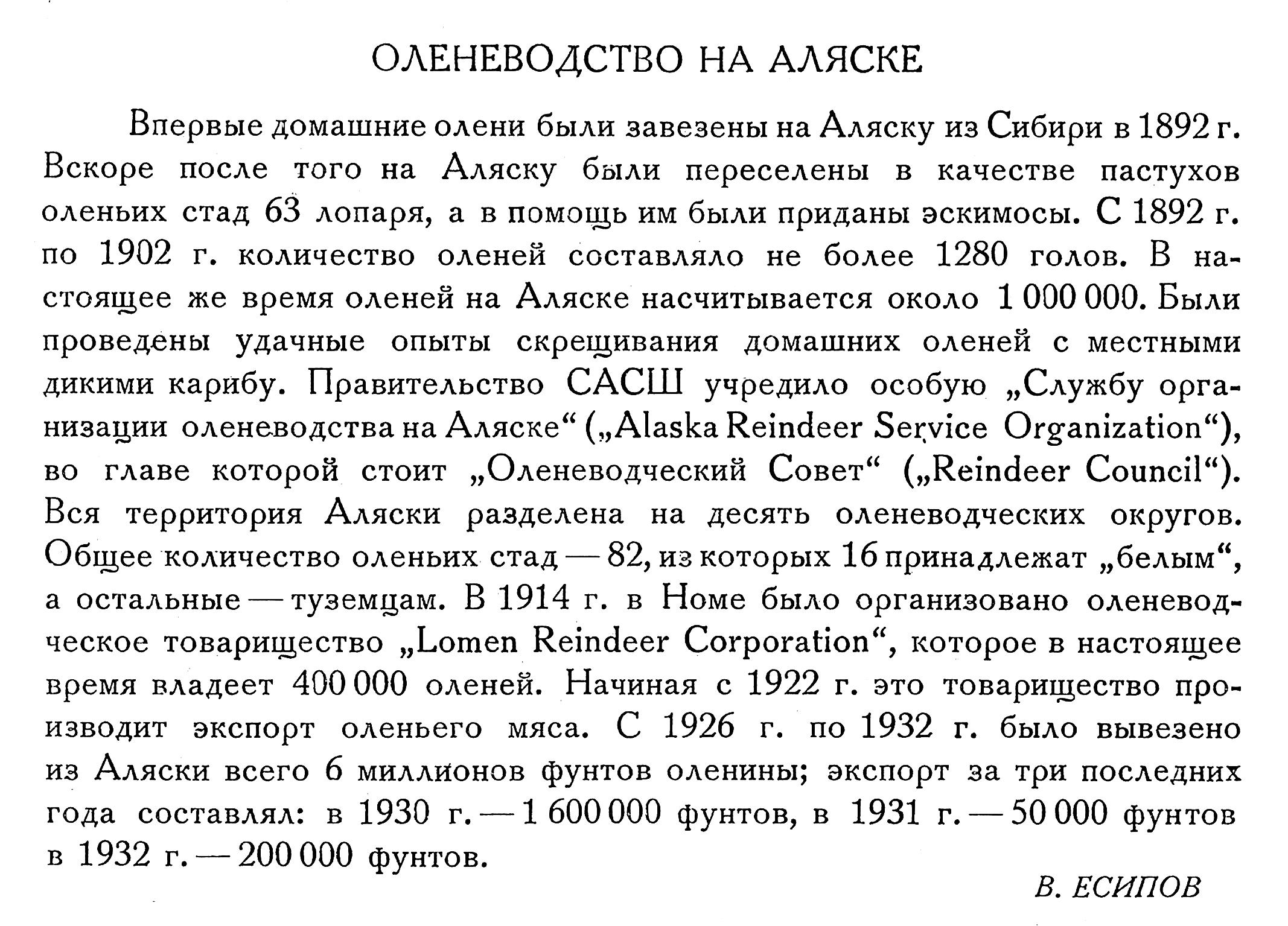 Впервые домашние олени были завезены на Аляску из Сибири в 1892 г. Вскоре после того на Аляску были переселены в качестве пастухов оленьих стад 63 лопаря, а в помощь им были приданы эскимосы. С 1892 г. по 1902 г. количество оленей составляло не более 1280 голов. В настоящее же время оленей на Аляске насчитывается около 1 000 000. Были проведены удачные опыты скрещивания домашних оленей с местными дикими карибу. Правительство САСШ учредило особую „Службу организации оленеводства на Аляске" („Alaska Reindeer Service Organization"), во главе которой стоит „Оленеводческий Совет" („Reindeer Council"). Вся территория Аляски разделена на десять оленеводческих округов. Общее количество оленьих стад — 82, из которых 16 принадлежат „белым", а остальные — туземцам. В 1914 г. в Номе было организовано оленеводческое товарищество „Lomen Reindeer Corporation", которое в настоящее время владеет 400 000 оленей. Начиная с 1922 г. это товарищество производит экспорт оленьего мяса. С 1926 г. по 1932 г. было вывезено из Аляски всего 6 миллионов фунтов оленины; экспорт за три последних года составлял: в 1930 г. — 1 600 000 фунтов, в 1931 г. — 50 000 фунтов в 1932 г. — 200000 фунтов.