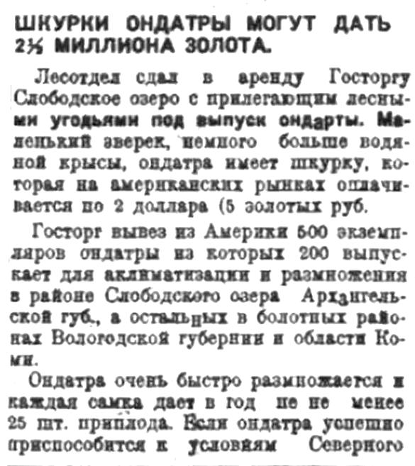 Госторг вывез из Америки 500 экземпляров ондатры из которых 200 выпускает для акклиматизации и размножения в районе Слободского озера Архангельской губ., а остальных в болотных районах Вологодской губернии и области Коми.