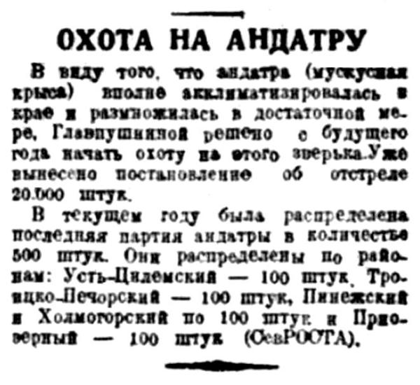 В виду того, что ондатра (мускусная крыса) вполне акклиматизировалась в крае и размножилась в достаточной мере, Главпушниной решено с будущего года начать охоту этого зверька. Уже вынесено постановление об отстреле 20.000 штук.