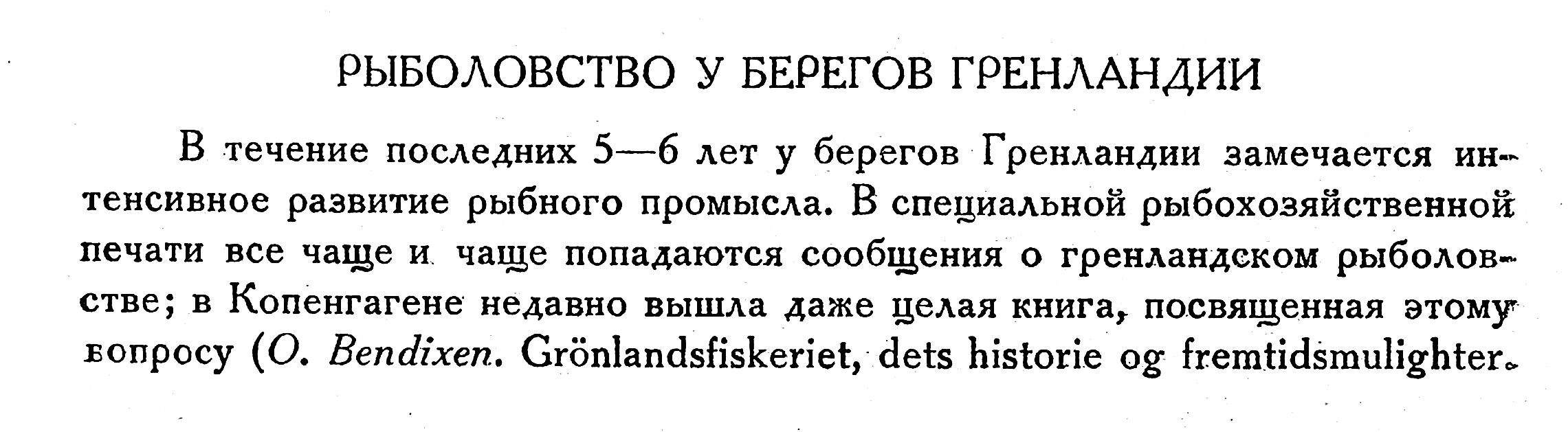 В течение последних 5—6 лет у берегов Гренландии замечается интенсивное развитие рыбного промысла. В специальной рыбохозяйственной печати все чаще и чаще попадаются сообщения о гренландском рыболовстве; в Копенгагене недавно вышла даже целая книга, посвященная этому вопросу (O. Bendixen. Grӧnlandsfiskeriet, dets historie og fremtidsmulighter.
