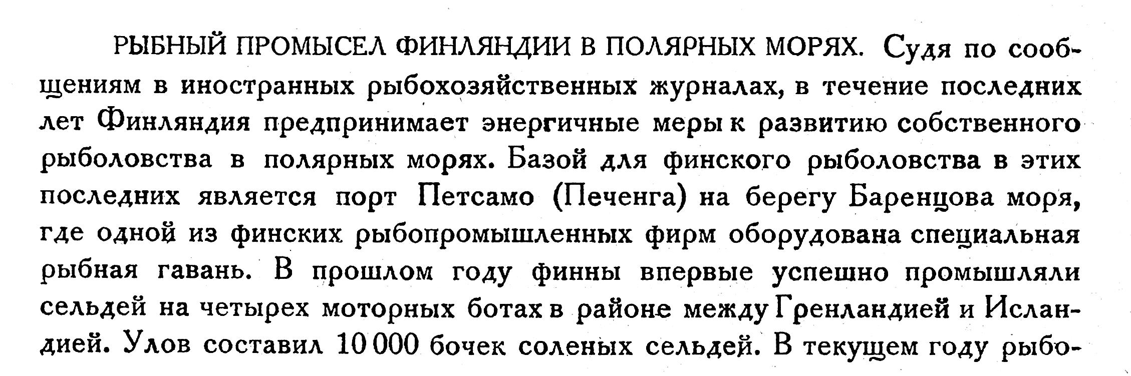 РЫБНЫЙ ПРОМЫСЕЛ ФИНЛЯНДИИ В ПОЛЯРНЫХ МОРЯХ. Судя по сообщениям в иностранных рыбохозяйственных журналах, в течение последних лет Финляндия предпринимает энергичные меры к развитию собственного рыболовства в полярных морях. Базой для финского рыболовства в этих последних является порт Петсамо (Печенга) на берегу Баренцова моря, где одной из финских рыбопромышленных фирм оборудована специальная рыбная гавань. В прошлом году финны впервые успешно промышляли сельдей на четырех моторных ботах в районе между Гренландией и Исландией. Улов составил 10000 бочек соленых сельдей. В текущем году рыбо-
