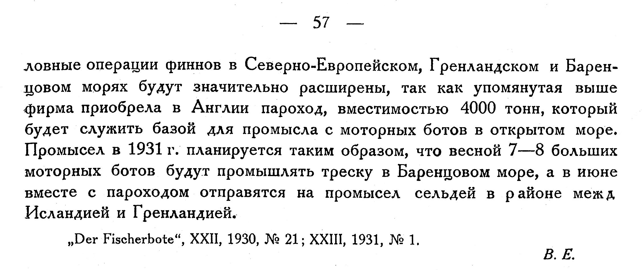 ловные операции финнов в Северно-Европейском, Гренландском и Баренцовом морях будут значительно расширены, так как упомянутая выше фирма приобрела в Англии пароход, вместимостью 4000 тонн, который будет служить базой для промысла с моторных ботов в открытом море. Промысел в 1931 г. планируется таким образом, что весной 7—8 больших моторных ботов будут промышлять треску в Баренцовом море, а в июне вместе с пароходом отправятся на промысел сельдей в районе между Исландией и Гренландией.