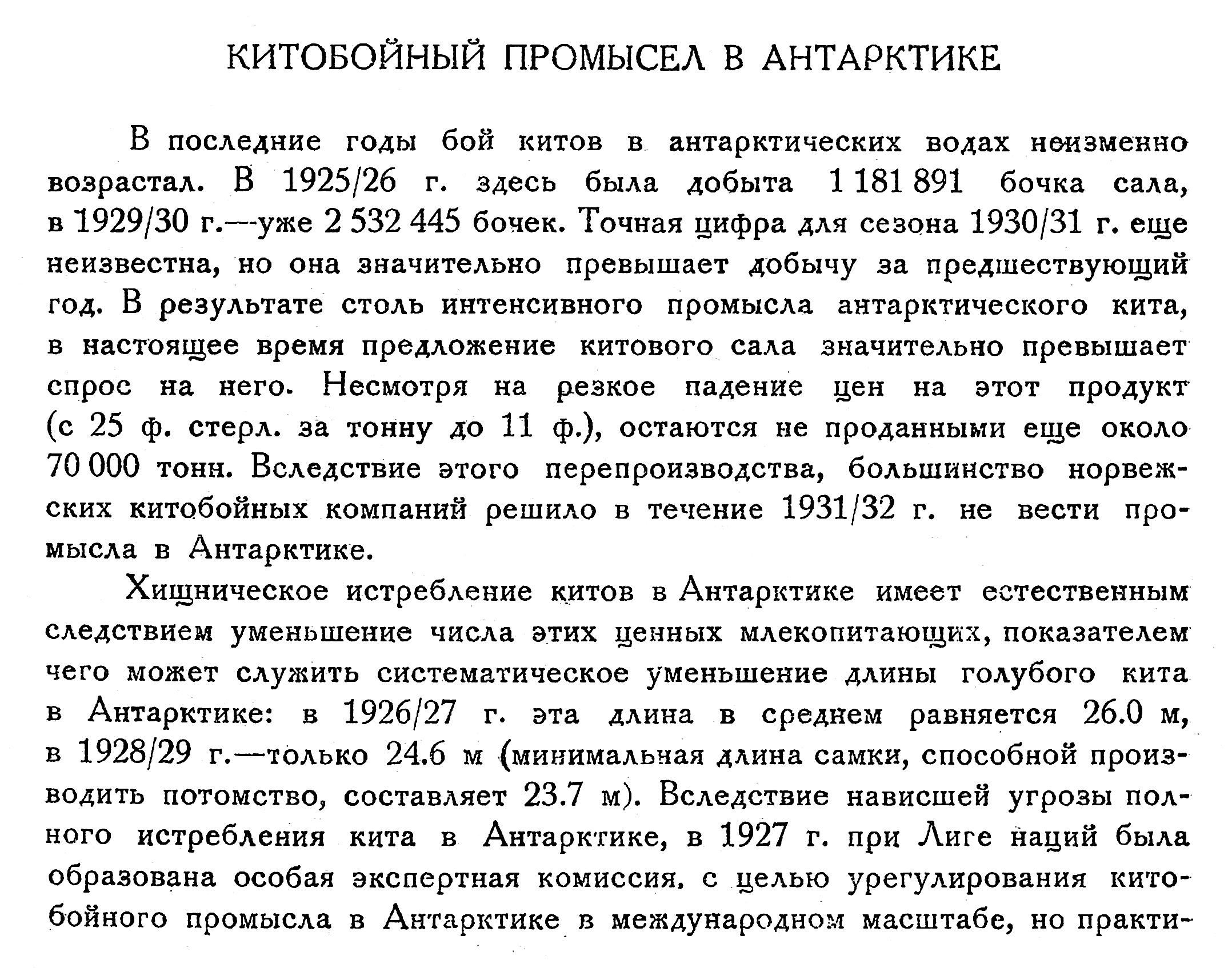 В последние годы бой китов в антарктических водах неизменно возрастал. В 1925/26 г. здесь была добыта 1181891 бочка сала, в 1929/30 г.— уже 2 532 445 бочек. Точная цифра для сезона 1930/31 г. еще неизвестна, но она значительно превышает добычу за предшествующий год. В результате столь интенсивного промысла антарктического кита, в настоящее время предложение китового сала значительно превышает спрос на него. Несмотря на резкое падение цен на этот продукт (с 25 ф. стерл. за тонну до 11 ф.), остаются не проданными еще около 70 000 тонн. Вследствие этого перепроизводства, большинство норвежских китобойных компаний решило в течение 1931/32 г. не вести промысла в Антарктике.
