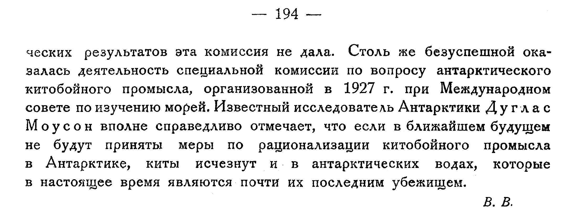 ческих результатов эта комиссия не дала. Столь же безуспешной оказалась деятельность специальной комиссии по вопросу антарктического китобойного промысла, организованной в 1927 г. при Международном совете по изучению морей. Известный исследователь Антарктики Дуглас Моусон вполне справедливо отмечает, что если в ближайшем будущем не будут приняты меры по рационализации китобойного промысла в Антарктике, киты исчезнут и в антарктических водах, которые в настоящее время являются почти их последним убежищем.
