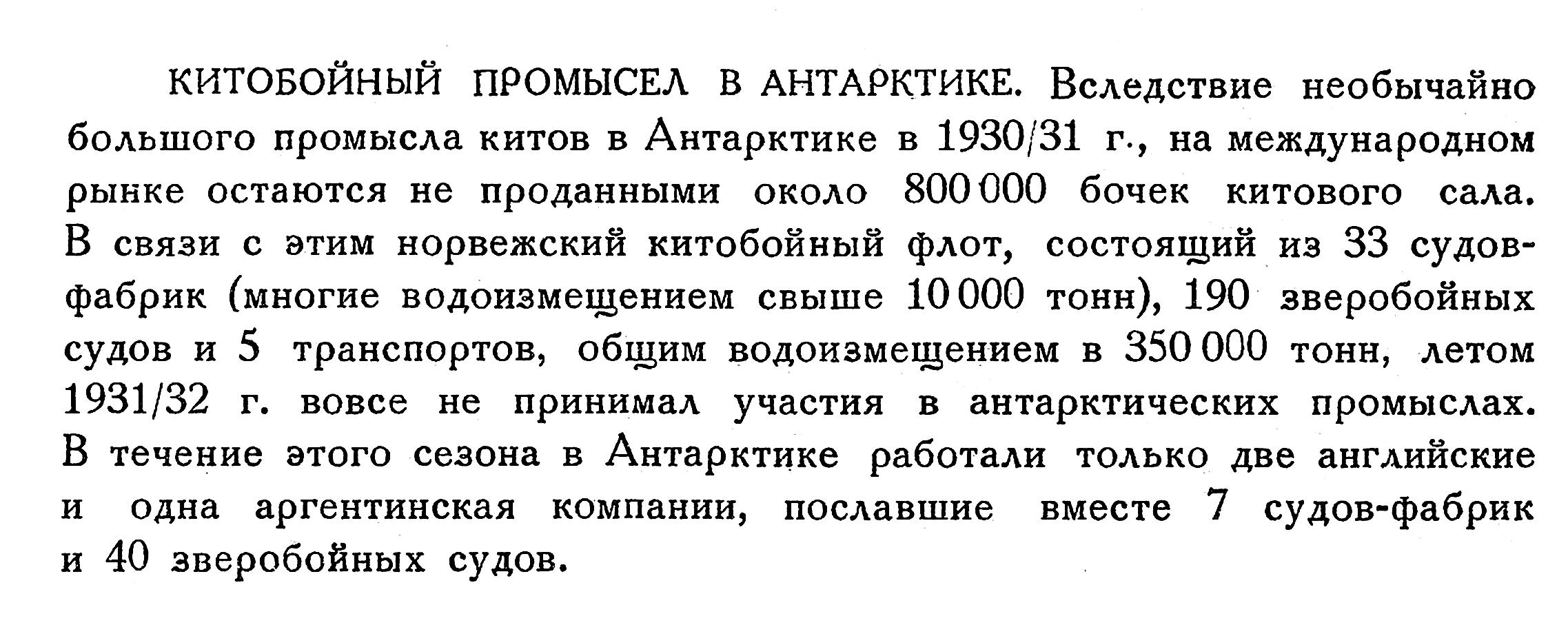 КИТОБОЙНЫЙ ПРОМЫСЕЛ В АНТАРКТИКЕ. Вследствие необычайно большого промысла китов в Антарктике в 1930/31 г., на международном рынке остаются не проданными около 800 000 бочек китового сала. В связи с этим норвежский китобойный флот, состоящий из 33 судов-фабрик (многие водоизмещением свыше 10 000 тонн), 190 зверобойных судов и 5 транспортов, общим водоизмещением в 350 000 тонн, летом 1931/32 г. вовсе не принимал участия в антарктических промыслах. В течение этого сезона в Антарктике работали только две английские и одна аргентинская компании, пославшие вместе 7 судов-фабрик и 40 зверобойных судов.