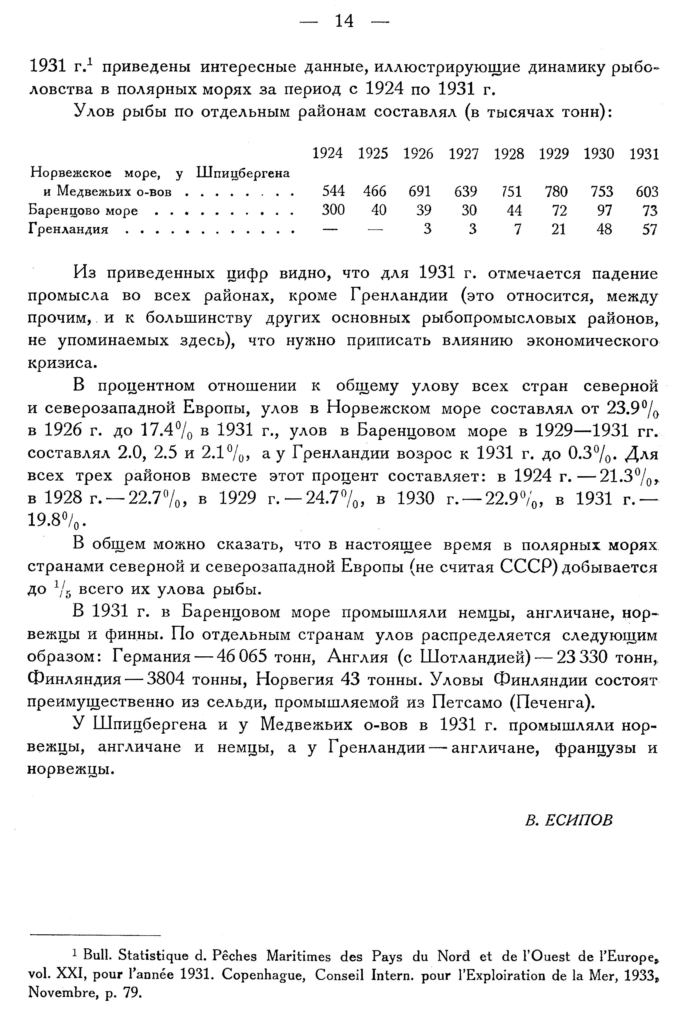 Из приведенных цифр видно, что для 1931 г. отмечается падение промысла во всех районах, кроме Гренландии (это относится, между прочим, и к большинству других основных рыбопромысловых районов, не упоминаемых здесь), что нужно приписать влиянию экономического кризиса.