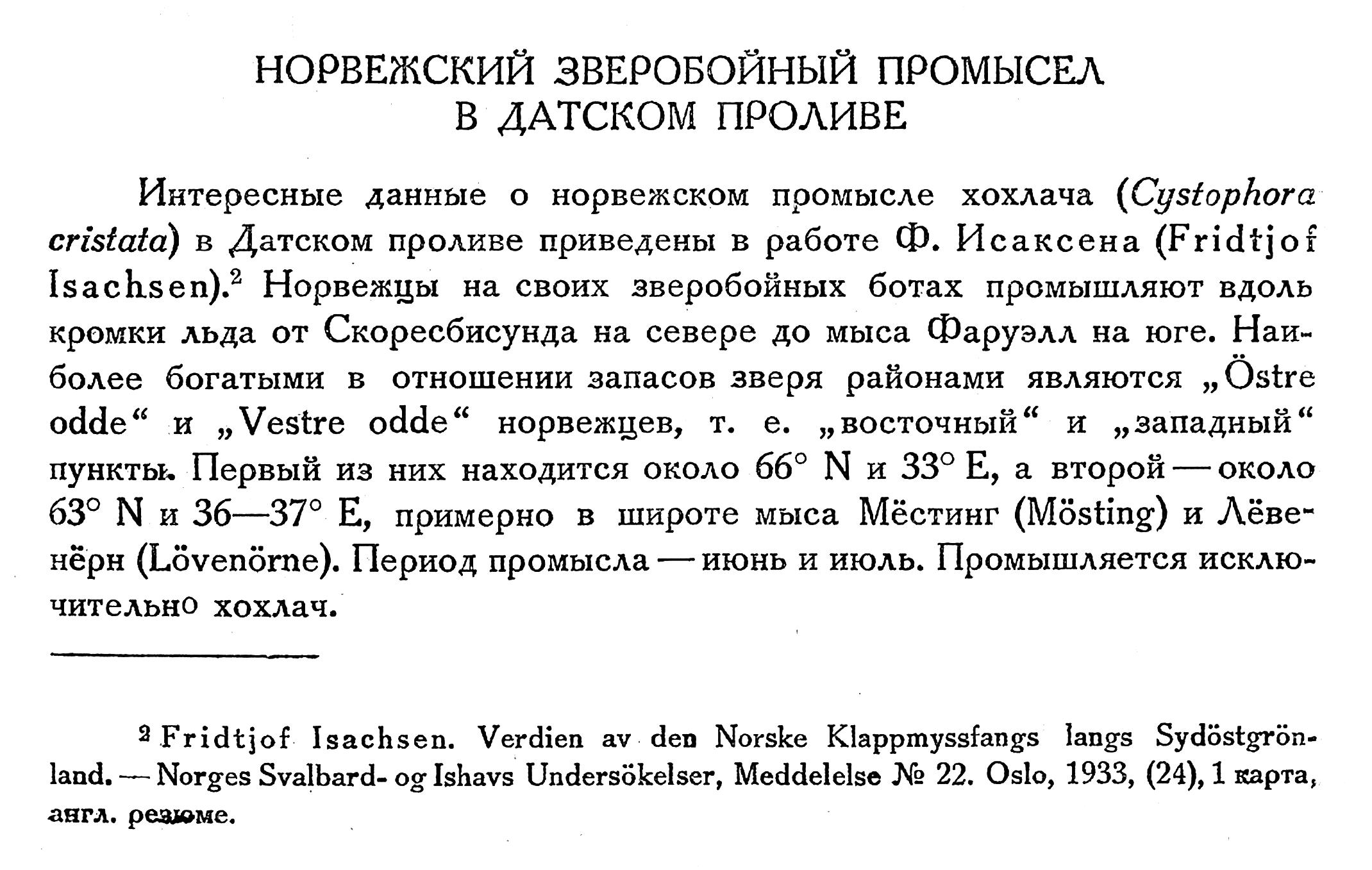 Интересные данные о норвежском промысле хохлача (Cystophora cristata) в Датском проливе приведены в работе Ф. Исаксена (Fridtjof Isасksen). 2) Норвежцы на своих зверобойных ботах промышляют вдоль кромки льда от Скоресбисунда на севере до мыса Фаруэлл на юге. Наиболее богатыми в отношении запасов зверя районами являются „Őstre odde“ и „Vestre odde“ норвежцев, т. е. „восточный“ и „западный“ пункты. Первый из них находится около 66° N и 33° Е, а второй — около 63° N и 36—37° Е, примерно в широте мыса Мёстинг (Mősting) и Лёвенёрн (Lővenőe). Период промысла — июнь и июль. Промышляется исключительно хохлач.