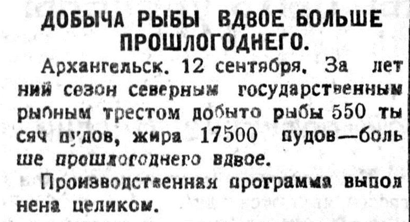 Архангельск. 12 сентября. За летний сезон северным государственным рыбным трестом добыто рыбы 550 тысяч пудов, жира 17500 пудов — больше прошлогоднего вдвое.